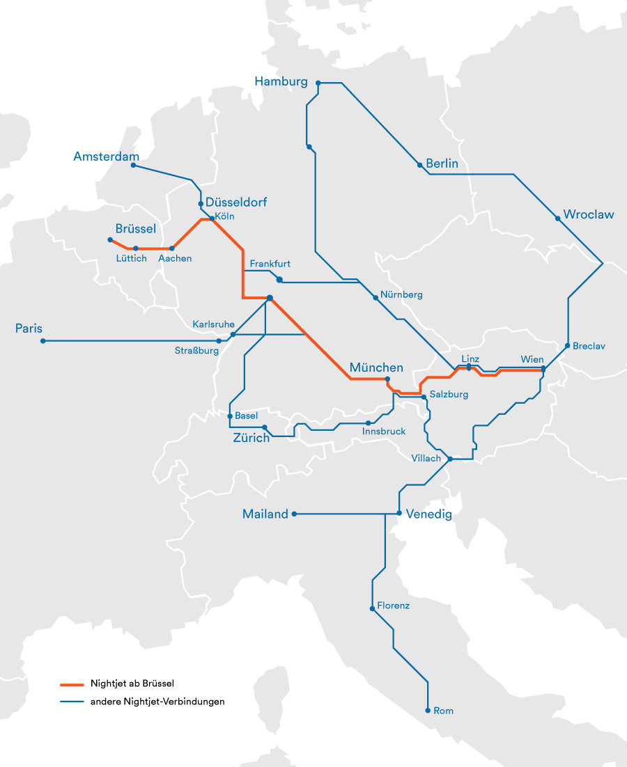 Mit dem ÖBB Nightjet Nachtzügen reisen Sie zwischen Österreich und Belgien, Deutschland, den Niederlanden, der Schweiz und Italien.