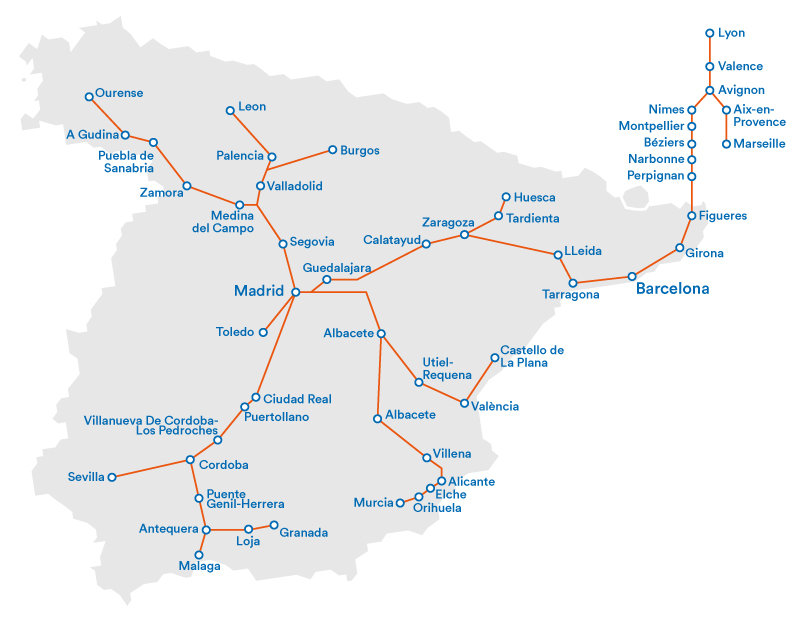 Das AVE-Netz ist das größte Hochgeschwindigkeitsnetz in Europa, mit Schwerpunkt Madrid. Die Höchtstgeschwindigkeit der AVE-Züge erreicht 300 km/h. Sie sind Teil des Fernverkehrsangebots von Renfe (Larga Distancia).