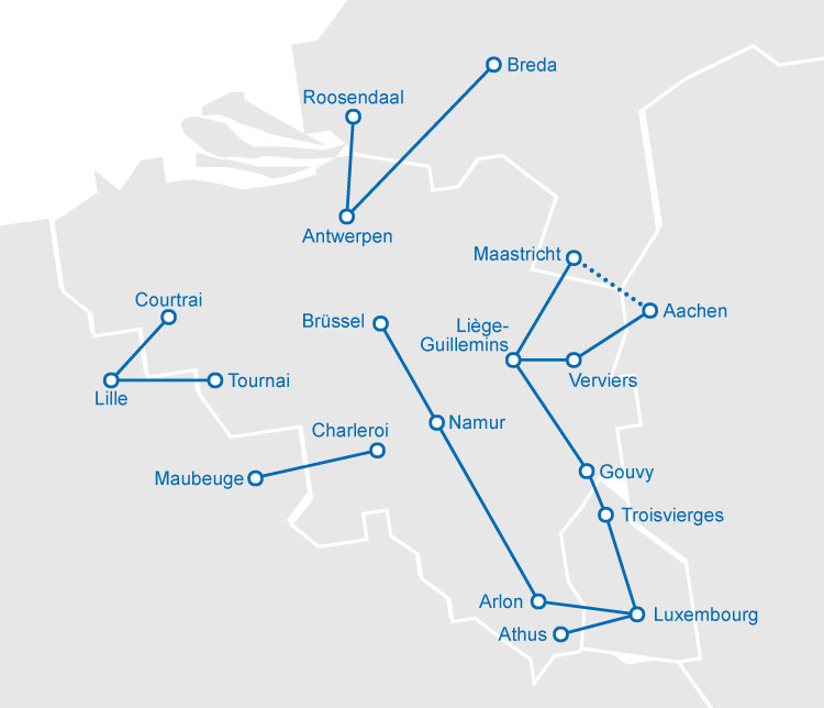 These fares apply to travel between any station in Belgium and Lille, Maubeuge, Aachen, Maastricht and Roosendaal, as well as on the Belgian part of the journey between any station in Belgium and any station in the Grand-Duchy of Luxembourg.